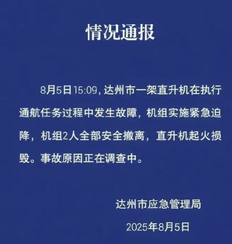 8 月 5 日 15 时 09 分,四川达州一架执行通航任务的直升机突发故障,机组人员实施紧急迫降后全部安全撤离,但直升机起火损毁。目前,事故原因仍在调查中。这起事件虽未造成人员伤亡,却再次为通用航空的安全运营敲响警钟,也引发了对通航事故预防与应急处置体系的深度思考。